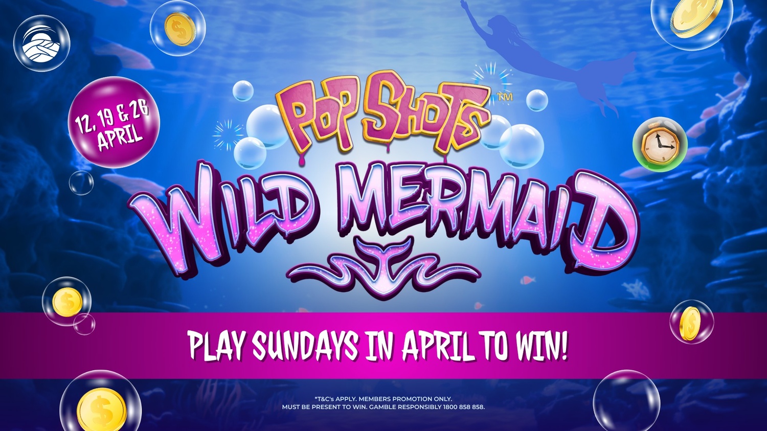 Pop in every Sunday from the 12th to the 26th of April for your chance to win a share of $400 in CASH & prizes in our Leaderboard game - Pop Shots Wild Mermaid!